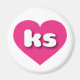 This magnet features a vibrant, hot pink heart containing the bold, white, rounded lower case letters ks, a playful abbreviation for Kansas, the sunflower state.