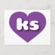 This postcard features a shapely and vibrant purple heart containing the bold, white, rounded lower-case letters ks, a playful abbreviation for Kansas, the sunflower state. The reverse side of the postcard is blank, awaiting your handwritten sentiments or customized text.
