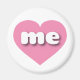 This magnet features a vibrant pink heart containing the bold, white, rounded lower case letters me, a playful abbreviation for Maine, the pine tree state.