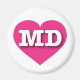 This magnet features a vibrant hot pink heart containing the bold, white, upper case letters MD, the official abbreviation for Maryland, the old line state.