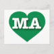 This postcard features a vibrant green heart containing the bold, white, upper-case letters MA, the official abbreviation for Massachusetts, the bay state. The reverse side of the postcard is blank, awaiting your customized text or handwritten sentiments.