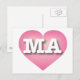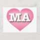 This postcard features a calm, cool, and collected pink heart with a white washed center containing the bold, white, upper case letters MA, the official abbreviation for Massachusetts, the bay state. The reverse side of the postcard is blank, awaiting your personalized text or handwritten sentiments.