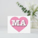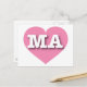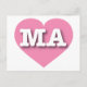 This postcard features a vibrant pink heart containing the bold, white, upper case letters MA, the official abbreviation for Massachusetts, the bay state. The reverse side of the card is blank, awaiting your personalized text or handwritten sentiments.