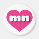This magnet features a vibrant hot pink heart containing the bold, rounded, white lower case letters mn, a playful version of the abbreviation for Minnesota, the north star state.