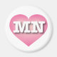 This magnet features a pink heart with a white-washed center overlaid by the capital letters MN, the official abbreviation for Minnesota, the north star state.