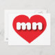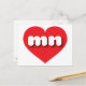 This postcard features a vibrant red heart containing the bold, white, rounded lower case letters mn, a playful abbreviation for Minnesota, the north star state. The reverse side of the card is blank, awaiting your customized text or handwritten sentiments.