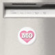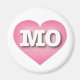 This magnet features a pink heart with a white-washed center containing the bold, white, upper case letters MO, the official abbreviation for Missouri, the show me state.