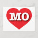 This postcard features a vibrant red heart containing the bold, white, upper case letters MO, the official abbreviation for Missouri, the show me state. The reverse side of the postcard is blank, awaiting your customized text or handwritten sentiments.
