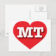 This postcard features a vibrant red heart containing the bold, white, upper case letters MT, the official abbreviation for Montana, the treasure state. The reverse side of the postcard is blank, awaiting your customized text or handwritten sentiments.
