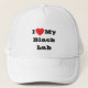Custom Trucker Style Baseball Hat In White Color and Black Text Color and casual fun fashion statement accessory printed with customizable template text phrase I ♥️ My Black Lab on Hats, Shirts and Pet Products by TheFabricSeal print on demand shop at Zazzle.com #ZazzleMade https://www.zazzle.com/store/thefabricseal