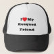 Custom Trucker Style Baseball Hat In Black and White Color and Black Text Color and casual fun fashion statement accessory printed with customizable template text phrase I ❤️ Love My Resqued Friend on Hats, Shirts and Pet Products by TheFabricSeal print on demand shop at Zazzle.com #ZazzleMade https://www.zazzle.com/store/thefabricseal