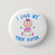 Cute button with "I Love My Twin Sister" in blue text and a cute baby girl in pink.