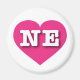 This magnet features a vibrant hot pink heart containing the bold, white, upper case letters NE, the official abbreviation for Nebraska, the cornhusker state.