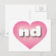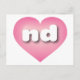 This postcard features a pink heart with a white-washed center containing the bold, white, rounded lower-case letters nd, a playful abbreviation for North Dakota, the peace garden state. The reverse side of the card is blank, awaiting your personalized text or handwritten sentiments.