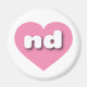 This magnet features a vibrant pink heart containing the bold, white, rounded lower case letters nd, a playful abbreviation for North Dakota, the peace garden state.