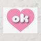 This postcard features a calm, cool pink heart containing the bold, rounded, white lower case letters ok, a playful version of the abbreviation for Oklahoma, the sooner state. The reverse side of the postcard is blank, awaiting your customized text or handwritten sentiments.