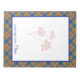 A bright tartan plaid border surrounds a pale trio of orange flowers on a blank writing space. Replace the current text at the bottom, "a message from Claire" with your own text to personalize your notepad. The flower accent can be removed if you wish.