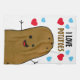 Fun happy brown potato surrounded by red and blue love hearts with I Love Potatoes in black and brown lettering above his head.