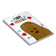 Fun happy brown potato surrounded by red and blue love hearts with I Love Potatoes in black and brown lettering above his head.