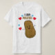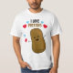 Fun happy brown potato surrounded by red and blue love hearts with I Love Potatoes in black and brown lettering above his head.