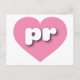 This postcard features a calm, cool pink heart containing the bold, rounded, white lower case letters pr, a playful version of the abbreviation for Puerto Rico, the enchanted isle.