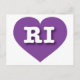 This postcard features a vibrant purple heart containing the bold, white, upper-case letters RI, the official abbreviation for Rhode Island, the ocean state. The reverse side of the card is blank, awaiting your personalized text or handwritten sentiments.