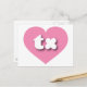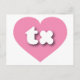 This postcard features a calm, cool pink heart containing the bold, white, rounded lower case letters tx, a playful abbreviation for Texas, the lone star state. The reverse side of the postcard is blank, awaiting your personalized text or handwritten sentiments.