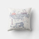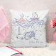 Whimsical throw pillow in navy blue and pink, of girl with sea waves for hair, on which float a boat and a whale. Little lighthouse in distance and "I love the sea" text
