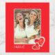 A red and white colored photo frame, cute red hearts and the words “I love U” in white text.