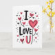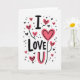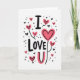 This card shows a white background with the big message “I LOVE U” right in the center. The words “I” and “LOVE” are in thick black letters that look slightly uneven, like they were drawn by hand. The “U” is bubblegum pink with a thin black outline, so it stands out in a sweet, simple way. Around the message, you’ll see lots of hearts in different sizes, some filled with pink and some just outlined, scattered like they’re drifting across the page. A few hearts sit on curved lines like little stems, and there are also small black dots and tiny cross marks sprinkled around like confetti. The whole design feels cheerful and affectionate, like a quick note you’d scribble when you really mean it 🥰. It’s an easy card to give when you want to say “I love you” without making a big speech ❤️, and it’s a friendly way to share Valentine’s Day sentiments.