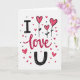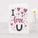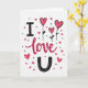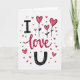 This card shows the words “I love U” in the middle on a white background. The “I” and the “U” are large, black letters with small white dash marks inside them, giving them a stitched look. Between them, the word “love” is written in a smooth, flowing black style that looks like a quick pen stroke. Above the message, three pink heart-shaped flowers sit on thin stems, like they’re growing up from the words. A few smaller pink hearts are scattered around, each with a lighter shine that makes them feel sweet and soft. The simple black-and-pink colors keep the focus on the message and make it easy to read at a glance ❤️. It feels meaningful to give because it says “I love you” in a direct, friendly way that works for romance or close friendship 🥰.