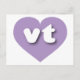 This postcard features a lavender heart containing the bold, white, rounded lower-case letters vt, a playful abbreviation for Vermont, the green mountain state. The reverse side of the card is blank, awaiting your customized text or handwritten sentiments.