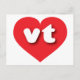 This postcard features a vibrant red heart containing the bold, white, rounded lower case letters vt, a playful abbreviation for Vermont, the green mountain state. The reverse side of the postcard is blank, awaiting your handwritten sentiments or customized text.