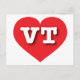 This postcard features a vibrant red heart containing the bold, white, upper case letters VT, the official abbreviation for Vermont, the green mountain state. The reverse side of the postcard is blank, awaiting your handwritten sentiments or customized text.