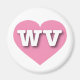 This magnet features a pink heart containing the bold, white, upper-case letters WV, the official abbreviation for West Virginia, the mountain state.