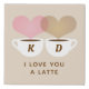 A cute "I love you a latte" personalized art for coffee lovers. Includes two coffee mugs with intertwined light pink and latte brown heart shaped steam and a cream colored background. Personalize the custom text with the couple's first name initials. Display on your kitchen counter or by your coffee bar station!