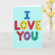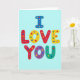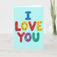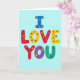 This card shows the words “I LOVE YOU” in big, cut-out letters on a light sky-blue background 🥰. The message is split across two lines, with “I LOVE” on top and “YOU” underneath, centered and easy to read. Each letter is a different color, including a deep blue “I,” red “L” and “V,” yellow “O” and “E,” a purple “O,” and a green “U.” The letters are covered in small polka dots in many colors, giving them a fun, textured look. The text looks like chunky cut-out shapes rather than thin lettering, so it feels direct and sincere. With the bright colors and simple layout, it comes across as warm, happy, and easy to give to a partner or a close friend ❤️. It’s a straightforward way to say what you feel, and it makes sharing Valentine’s Day sentiments feel natural.