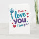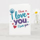 This card features the words “I love you” front and center on a white background, making the message easy to see right away ❤️. The main “I love” is written in teal with smooth, flowing letters, like it was drawn in one confident stroke. Just below, “YOU” is in glossy purple with a shaded, 3D look that makes it feel raised off the page. Above the main message, there’s another “I love” in bright red using simpler lettering, adding a sweet echo to the big phrase. Small red hearts are scattered around the words, and teal dots gather in the upper left like a little burst of confetti. More tiny dots and mini hearts float around the center, keeping the design light and happy without distracting from the message. Near the bottom, a smaller “I love you” appears again in a casual handwritten style, like a quiet repeat meant just for the person reading it 🥰. It feels meaningful because it says what you might struggle to say out loud, and it’s a friendly way to share Valentine’s Day feelings with someone you care about.