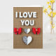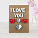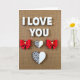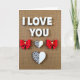 This greeting card shows a burlap-textured background that feels warm and down-to-earth. Across the top, the words “I LOVE YOU” appear in raised white letters with simple, neat shapes that stand out clearly. Below the message are two red ribbon bows with a satin shine, each finished with a small gold bead at the center. Between and beneath the bows sit hearts that are split into two looks: one side is solid white, and the other side has a detailed black-and-white pattern like tiny tiles. A larger heart lower down repeats the same half-and-half style, tying the whole design together. The mix of soft fabric texture, bright red ribbons, and contrasting hearts makes it feel thoughtful and steady, like love that’s both simple and full of details. It’s a meaningful card to give when you want to say “I love you” in a way that feels honest and close 🥰❤️.