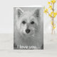 A beautiful greeting card with a black and white photograph of a stunning, innocent looking Westie dog (West Highland White Terrier) on the front. On the front of the card it has the wording 'I love you...' in white. The inside of the card has been left blank for you own special message. On the back of the card is another stunning Westie dog image, this image shows a little Westie dog just chilling out and relaxing. If you are looking for a card to melt the heart of someone special then look no further, this card is sure to capture the heart of everyone who receives it.