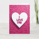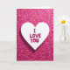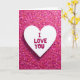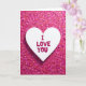 This greeting card centers on a bright white heart that really stands out against the background. Inside the heart, the words “I LOVE YOU” appear in strong fuchsia letters, placed right in the middle so the message is clear. Around the heart is a textured field made from many tiny, uneven square pieces in fuchsia, magenta, and coral pink. Small white specks are scattered across the background like confetti, giving it a light sparkle. The lighting is soft and even, and you can see a slight shadow that helps the heart look raised from the surface. Overall, it feels romantic, happy, and a little celebratory, like a simple way to say what you mean 💘❤️.