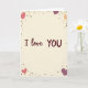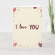 This card centers on the words “I love YOU” in deep maroon on a soft cream background that feels warm and calm. The “I love” part looks like casual handwriting, while “YOU” is in all caps with rounded letter shapes that stand out. The text sits in the middle of the front, making it the first thing you notice. Around the edges, partial heart shapes peek in from the corners in coral pink, light peach, and deep plum. Small scattered dots in gold and bronze tones sit around the hearts like confetti, adding a light party feel without taking over. The layout stays simple and balanced, with the border details keeping your eyes on the message. It’s a sweet choice for romance, affection, or close friendship, and it feels easy to give with love 💘❤️.
