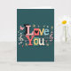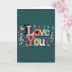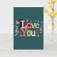 This greeting card centers on the words “I LOVE YOU” set on a deep, dark teal background. The letters look raised and textured, with small shadows that make them feel like sturdy cutouts. “I” is black, the “L” is soft pink, the “O” is a red square holding a black heart, the “V” is yellow, and the “E” is light blue. Below that, “You” sits on the second line with a red “Y,” a yellow “O,” and a creamy white “U,” all in the same chunky, shaped-letter style. Thin white music staff lines run across the card with treble and bass clefs, giving the whole scene a gentle, singing feel. Small star-shaped flowers and tiny dots in pink, yellow, and white are scattered around, and there’s a pink butterfly near the “I.” It feels meaningful because it pairs a simple message with sweet details that say love can be steady, tender, and fun 🥰❤️, and it’s a lovely way to share Valentine’s Day sentiments.