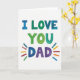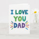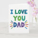 This card features the big message “I LOVE YOU DAD” right in the center, written in chunky uppercase letters that look like they were colored in by hand. The background is plain white, which makes the words stand out right away. The “I” and parts of “LOVE” are filled with blues and greens, with visible marker-like lines that give the letters a kid-drawn feel. “YOU” continues in bright green shades like lime and emerald, keeping the mood upbeat and sweet. “DAD” sits at the bottom in deep blue and purple, and short colorful dash marks radiate around it in red, yellow, orange, and blue like little bursts of excitement. The lettering has a slightly uneven, textured look, which makes it feel honest and caring rather than perfect. It’s a simple way to say love and thanks to a dad, and it can bring back warm memories of early drawings and big feelings 🥰❤️.