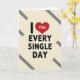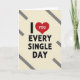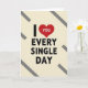 This design shows an off-white background with a lightly speckled, worn texture that feels cozy and familiar. The main message reads “I ❤️ YOU EVERY SINGLE DAY,” set in strong black sans-serif letters across the center. A textured red heart replaces the word “love,” and the word “YOU” sits inside the heart in black letters, making it the clear focus ❤️. The words are all in uppercase, with “EVERY SINGLE DAY” placed below in the same dark lettering so the message lands plainly and honestly. Four soft gray diagonal lines sit near the edges like simple corner accents, also with a slightly weathered look. The limited colors—black, red, gray, and off-white—keep attention on the promise of caring every day. It’s meaningful to give because it doesn’t try too hard; it just says what you feel in a steady, reassuring way 🥰.