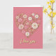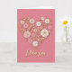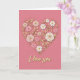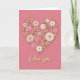 This design shows a large heart centered on a soft rose-pink background, outlined in a thin gold line. Inside the heart, you see layered flowers that look slightly raised, with ivory and blush roses and small white daisies with yellow centers. Golden leaves curl between the blooms, along with tiny little blossoms that catch the light. Gentle shadows around the petals make the whole arrangement feel full and textured, like it’s floating just above the card. Under the heart, the words “I love you” appear in flowing gold lettering with a glittery look, placed near the bottom center. The simple message and the careful details make it feel like a sincere way to show affection, whether for a partner or someone you care about 🥰. It’s an easy card to give when you want your feelings to come through without saying too much ❤️, and it’s perfect for sharing Valentine’s Day.