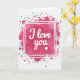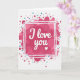 This greeting card centers on a deep fuchsia square with the words “I love you” written in flowing white lettering, ending with a small white heart ❤️. A rough-looking white border surrounds the square, like a lightly torn edge that makes the message feel a little more human and close. Behind it, overlapping circles in many shades of pink spread outward, giving the background a soft, layered look. Small blue dots and paint-like splatters are scattered around the pink shapes and onto the white space, adding a fun contrast without taking over. The main text sits right in the middle of the card, so your message is the first thing someone sees. The mix of warm pinks and cool blues keeps it sweet and calm, which fits romance, affection, or close friendship 🥰. It’s a simple way to say what you mean when you want someone to feel cared for and chosen. Hope it helps you share your Valentine’s Day feelings in a kind, honest way.