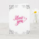 This card features the words “I love you” in bright fuchsia lettering centered on a white background. The letters are flowing and rounded, and the last stroke of “you” curls into a small heart shape. In each corner, there are soft gray flowers and leaves with gentle shading, like a quiet frame around the message. The strong pink against the white makes the words easy to notice right away, while the gray floral details keep it calm and sweet. It feels meaningful because it says exactly what you want to say, without needing anything extra, and the little heart in the lettering adds a tender touch. The text sits right in the middle, with plenty of open space around it, so it feels focused and sincere 🥰. It’s a simple way to show love or close friendship, and it works for a partner, a crush, or someone you care about ❤️. Hope it helps you share your Valentine’s Day sentiments.
