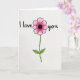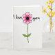 This greeting card shows a bright pink flower with lots of rounded petals outlined in black, set against a white background. The center of the flower is a solid black circle, which makes the pink stand out even more. A thin green stem runs down from the bloom, with two green leaves that have simple line shading for detail. The message reads “I love you,” with “I love” placed to the left of the flower and “you” placed to the right. The letters look like casual handwriting in black ink, with “you” written a bit looser than the rest, which makes it feel extra human and sweet 🥰. The simple drawing and direct message make it easy to give to a partner or a close friend when you want your feelings to be clear ❤️.