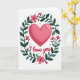 This card shows a large rose-pink heart in the middle, with gentle shading that makes it look soft and warm. Around the heart is a leafy wreath in deep forest green and lighter sage tones. Tucked into the leaves are coral and rich crimson flowers, with a mix of open blooms and small buds. Near the bottom, the words “I love you” appear in red cursive-style lettering, centered beneath the heart. The background is white, and there are a few tiny dots and small starburst shapes sprinkled around the design. It feels sweet and caring, like a simple way to say what you mean without needing a long note 🥰. Whether it’s for a partner or someone close to your heart, it’s a gentle reminder that they’re loved ❤️. Hope it helps you share your Valentine’s Day feelings in a warm, honest way.